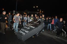 La marcha que partió en la UNAP se realizó en forma pacífica. Al llegar al punto donde finalizaba con un acto cultural. Sin embargo, (como se señala en nota Destacada), éste se vio interrumpido con la quema de un ataud, que representaba la muerte de la educación pública.