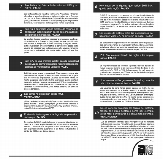 A través de un comunicado que firman las asociaciones gremiales de empresarios de Zona Franca, se responde a cada uno de los punos de la Sociedad Administradora, ZOFRI S.A., manteniendo su postura crítica frente a la gestión de este organismo. En la jornada de ayer, Zofri SA publicó una inserción en el Diario La Estrella, con posiciones adversas sobre los temas estrtégios de la Zona Franca, los cuales son rebatidos por los empresarios.