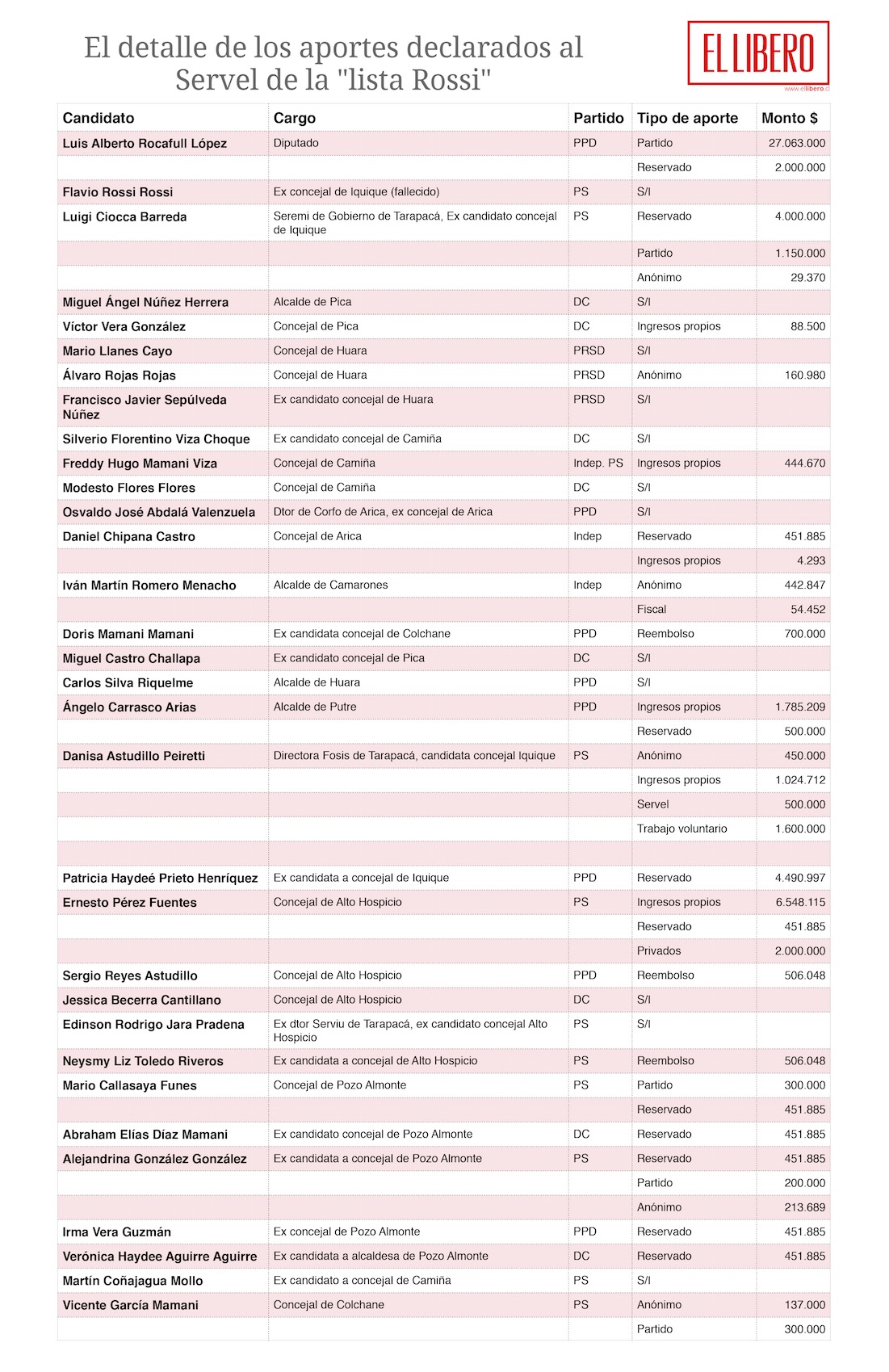 Otros candidatos, como Luigi Ciocca Barreda, actual seremi de Gobierno de Tarapacá, ex candidato a concejal por Iquique y primo del senador Rossi, declaró $4 millones en aportes reservados; el candidato a la alcaldía de Arica y actual diputado, Luis Alberto Rocafull, declaró $2 millones, Patricia Prieto Henríquez, ex candidata a concejal de Iquique, consignó $4.490.997 y Ángelo Carrasco, alcalde de Putre, declaró $500 mil en el mismo ítem.