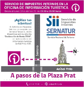 Para apoyar a los contribuyentes en su declaración de la Renta 2016, Sernatur Iquique, se sumó a la Operación Renta 2016, habilitando en la Oficina de información turística, un espacio de atención a los contribuyentes.