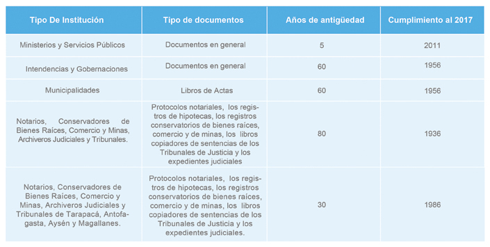 La siguiente tabla, publicada en la página del Archivo Nacional, da cuenta de los plazos, tomando este año 2017 como referente del cumplimiento de las disposiciones legales.