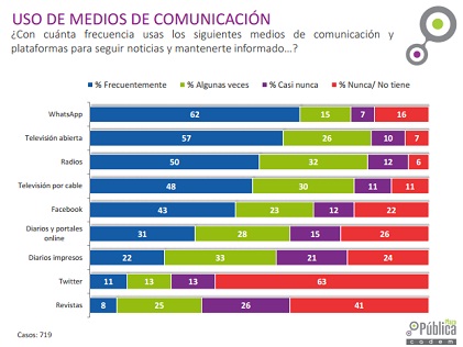 Con un 62%, la plataforma whatsApp supera a la Televisión Abierta, con un 57%, entre los principales medios de comunicación y plataformas para seguir noticias o mantenerse informado, según la encuestra de opinión pública, cadem; mientras que la Radio se mantiene como la más confiable con un 69%. En relación a la carrera presidencial, Sebastián Piñera se mantiene en primer lugar en intención de voto espontáneo con un 24% de las menciones, seguido por Alejandro Guillier con un 15% y Beatriz Sánchez con un 9%.