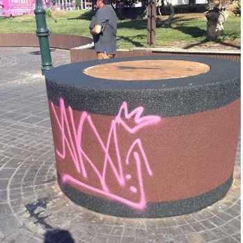 Tal es el caso del más tradicional espacio público de nuestra ciudad, la Plaza Arturo Prat, que amaneció con una de sus bases para áreas verdes rayada con un graffiti tipo tag, lo mismo que una estructura de concreto del lugar. El hecho, ocurre a sólo tres días de los mencionados trabajos de Aseo y Ornato municipal.