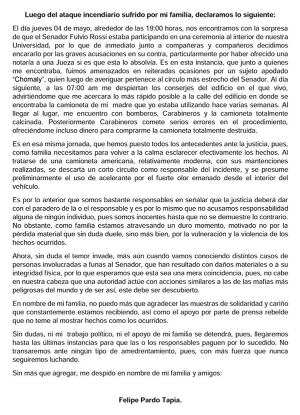 Una nueva arista aparece en el caso del atentado que sufrió Felipe Pardo Tapia, presidente saliente de la Federación de Estudiantes de la Universidad Arturo Prat, quien participó en la funa contra el Senador Fulvio Rossi. El estudiante acusa que en medio de la situación de shock en que se encontraba, producto del daño total que sufrió el vehículo familiar, un funcionario de carabineros, que tomaba el procedimiento del caso le dijo “te paso 200 o 400 mil pesos y me la llevo al tiro”, aludiendo a la camioneta.