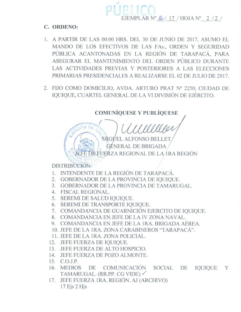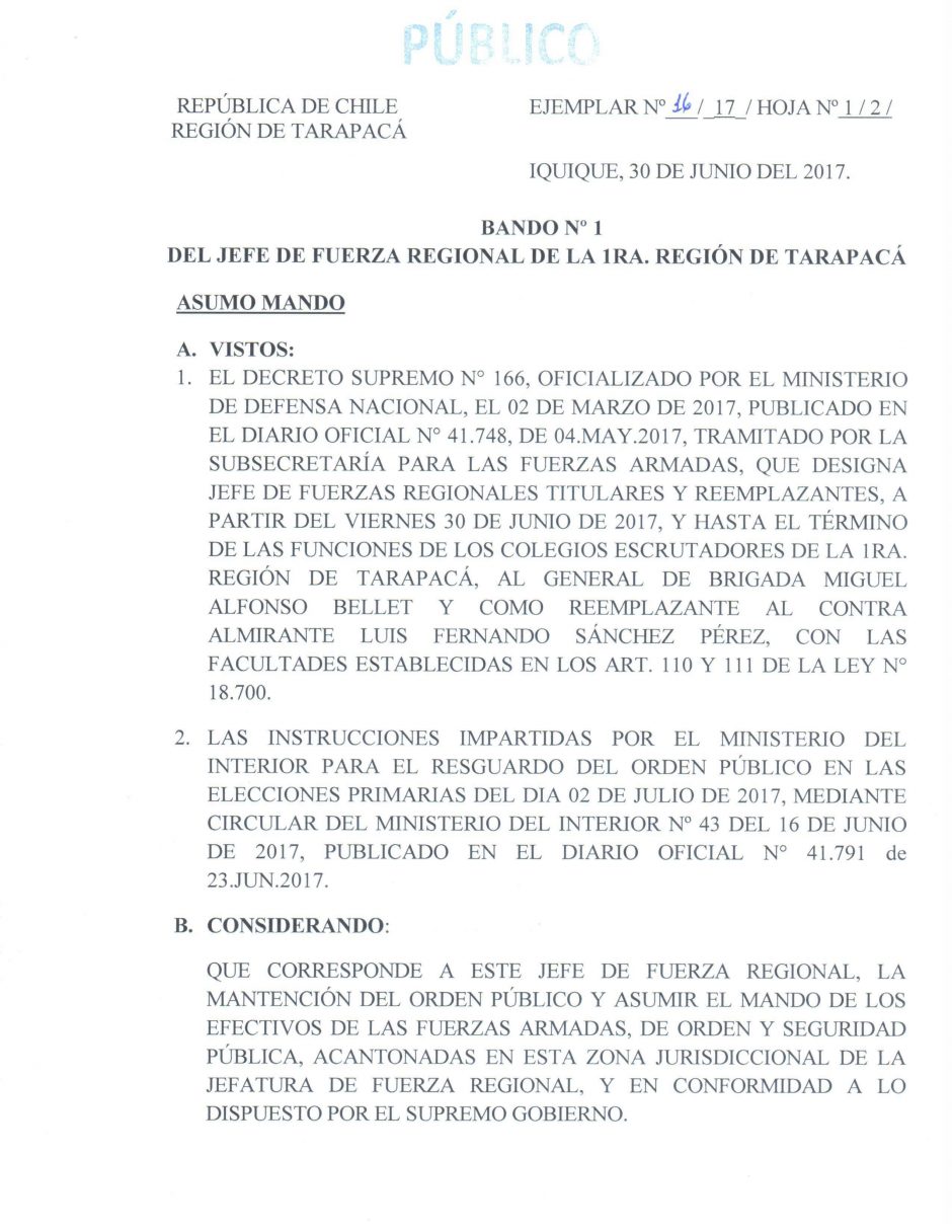 Conforme a lo que dispone la ley La Oficina de Comunicaciones y RR.PP. de la VI División de Ejército, en su condición de oficina de apoyo al Centro de Operaciones del Jefe de Fuerza Regional Tarapacá remite el Bando N°1 a los medios de comunicación social de la región, relacionado con el proceso de Elecciones de Primarias Parlamentarias y Presidenciales