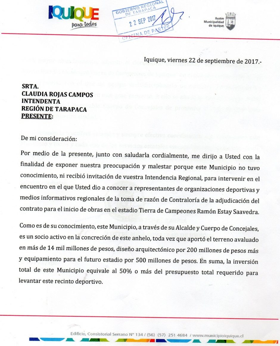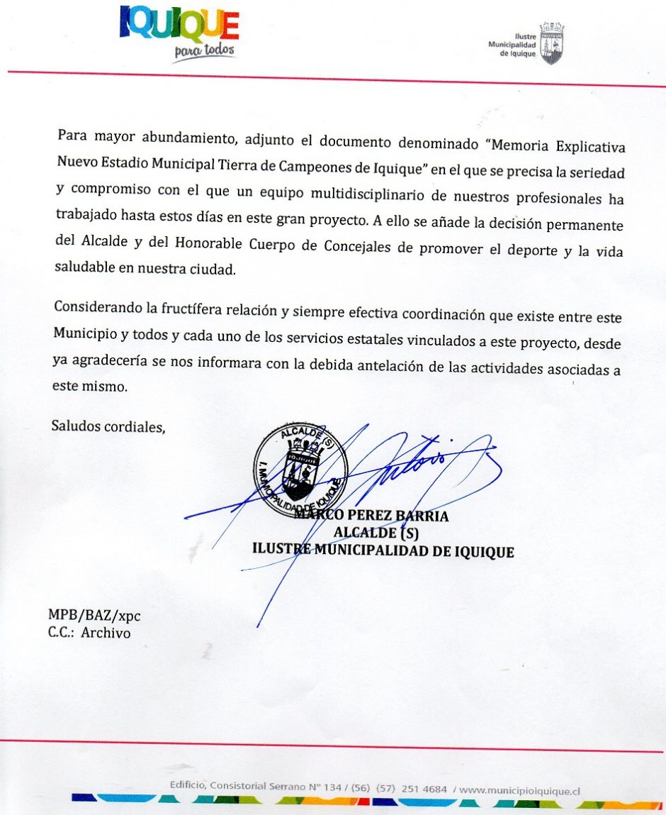 Es así que el Alcalde (s) Marco Pérez Barría, formalizó el malestar de la municipalidad, mediante misiva enviada a la Intendenta de Tarapacá, Claudia Rojas, en la que se expresa esta situación. Revisa la misiva y la Memoria 2016 del nuevo estadio.