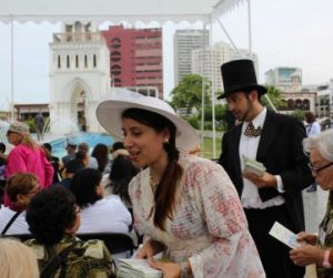 Vestidos a la vieja usanza, dos funcionarios de esta repartición, explicaron a los adultos mayores que llegaron a la Plaza Prat, en qué consiste el recorrido que se extiende a lo largo de la Zona Típica Baquedano y que explora la historia del salitre y la Guerra del Pacífico.