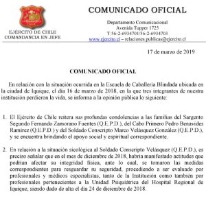 En relación con la situación ocurrida en la Escuela de Caballería Blindada ubicada en la ciudad de Iquique, el día 16 de marzo de 2018, en la que tres integrantes de nuestra institución perdieron la vida, se informa a la opinión pública lo siguiente:
