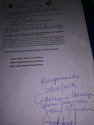 Las Comunidades, Pueblos y Organizaciones Aymara, Quechua, Diaguita y Mapuche  residentes en la Comuna Multicultural de Alto Hospicio, manifestaron  su rechazo y descontento con la primera reunión de proceso de Consulta Indígena, realizado este marte 28 de Mayo,  que pretende modificar la Ley 19.253 a través de 11 medidas que atentan «contra nuestros derechos y garantías ya reconocidas por el Estado».