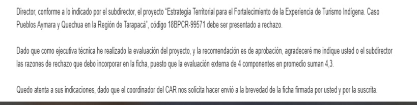 “Director, conforme a lo indicado por el subdirector, el proyecto “Estrategia Territorial para el Fortalecimiento de la Experiencia de Turismo Indígena. Caso Pueblos Aymara y Quechua en la Región de Tarapacá”, código 18BPCR-99571. Dado que como ejecutiva técnica he realizado la evaluación del proyecto, y la recomendación es de aprobación, agradeceré me indique usted o el subdirector las razones de rechazo que debo incorporar en la ficha, puesto que la evaluación externa de 4 componentes en promedio suman 4,3. Quedo atenta a sus indicaciones, dado que el coordinador del CAR nos solicita hacer envío a la brevedad de la ficha firmada por usted y la suscrita”