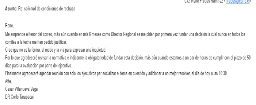 “René, Me sorprende el tenor del correo, más aún cuando en mis 6 meses como Director Regional se me piden por primera vez fundar una decisión la cual nunca en todos los comités a la fecha me han pedido justificar. Creo que no es la forma, el modo y la vía para expresar una inquietud. Por lo que agradeceré revisar la normativa e indicarme la obligatoriedad de fundar esta decisión, más aun cuando estamos a un par de horas de cumplir con el plazo de 50 días para la evaluación por parte del ejecutivo. 4 Finalmente agradeceré agendar reunión con solo los ejecutivos par socializar el tema en cuestión y adicionar a un mejor resolver, el día de hoy a las 10:30. Atte, Cesar Villanueva Vega DR Corfo Tarapacai”