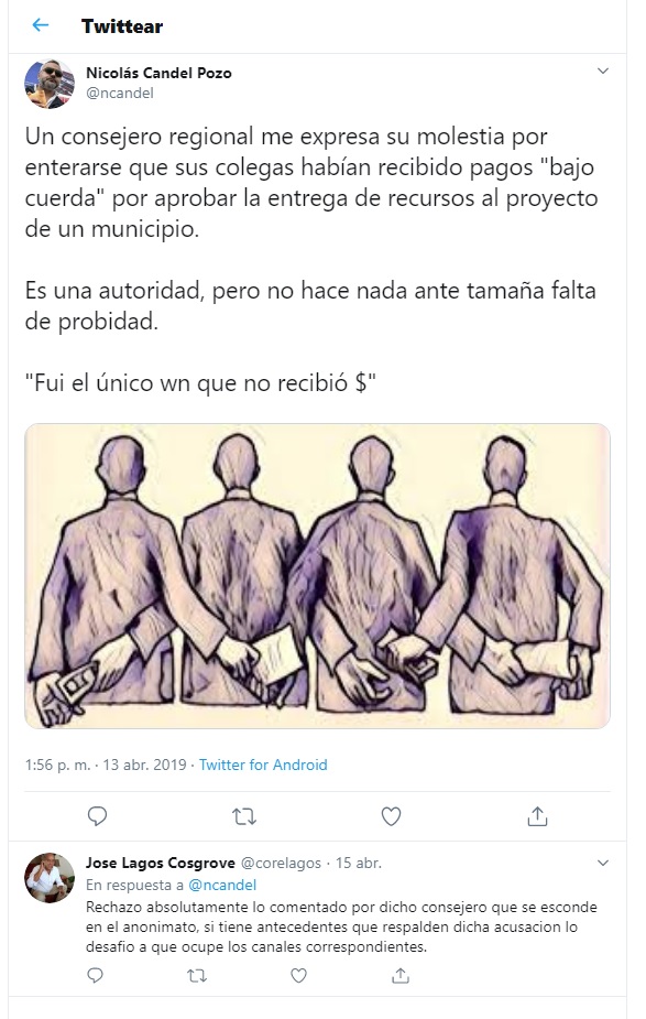“Un consejero regional me expresa su molestia por enterarse que sus colegas habían recibido pagos «bajo cuerda» por aprobar la entrega de recursos al proyecto de un municipio. Es una autoridad, pero no hace nada ante tamaña falta de probidad. «Fui el único wn que no recibió $»