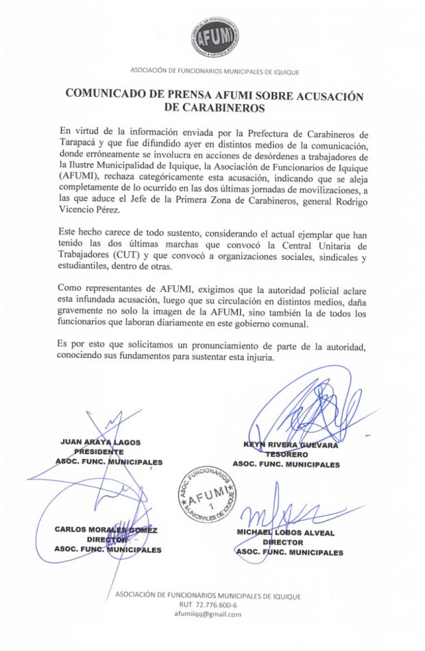 Su rechazo categórico a las acusaciones de Carabineros, en el sentido que funcionarios municipales arrojaron huevos y profirieron insultos a Carabieros, expresó la AFUMI, que agrupa a los funcionarios de la Casa Edilicia de Iquique.
