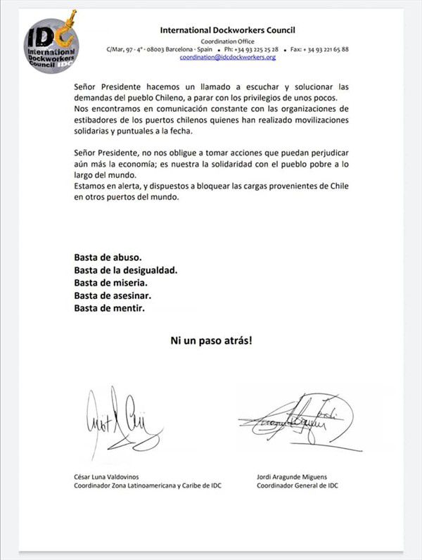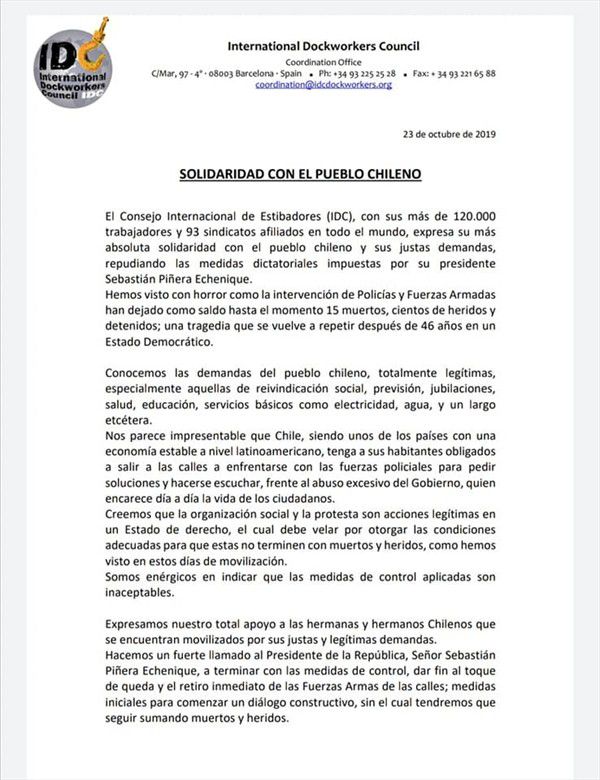 La International Dockworkers Council (IDC), instancia que reúne a 120 mil trabajadores y 93 sindicatos alrededor del mundo anunció que boicotearán la recepción de carga proveniente de Chile si el gobierno de Piñera continúa con la brutal represión a la rebelión popular.