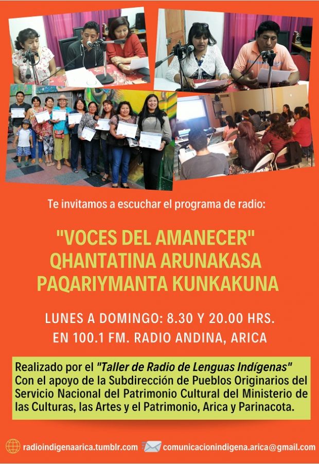 Para más información del Taller de Radio de Lengua de Indígenas de Arica, escuchar y compartir las producciones radiales, revisa la web: radioindigenaarica.tumblr.com. Contacto: co************************@***il.com
