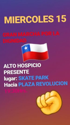 Una masiva marcha por la Dignidad, en el contexto de las movilizaciones, se realizará este miércoles 15 en la comuna de Alto Hospicio, con... Gran Marcha por la Dignidad en Alto Hospicio, desde el Skate Park del sector de La Pampa, a la Plaza Belén