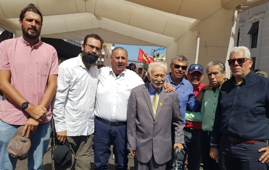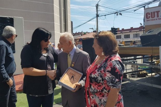Con ciertas dificultades, el hoy extinto dirigente, recibió el premio que le entregó Esmeralda Contreras, actual dirigente de la CUT, junto a la tesorera de ese organismo de trabajadores, Guadalupe Salas.
