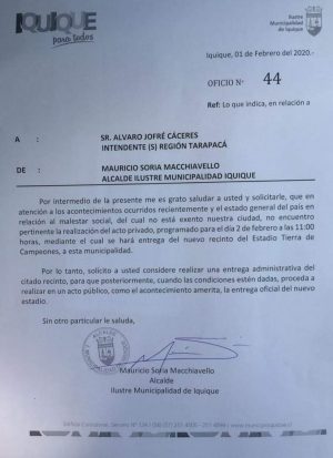 En la misiva, Soria Macchiavello explica que «en atención a los acontencimientos ocurridos recientemente, y el estado general del país en relación al malestar social del cual no está exento nuestra ciudad, no encuentro pertinente la realización del acto privado programado para el día 02 de febrero a las 11:00 horas, mediante el cual se hará entrega del nuevo recinto del Estadio Tierra de Campeones a esta municipalidad”.