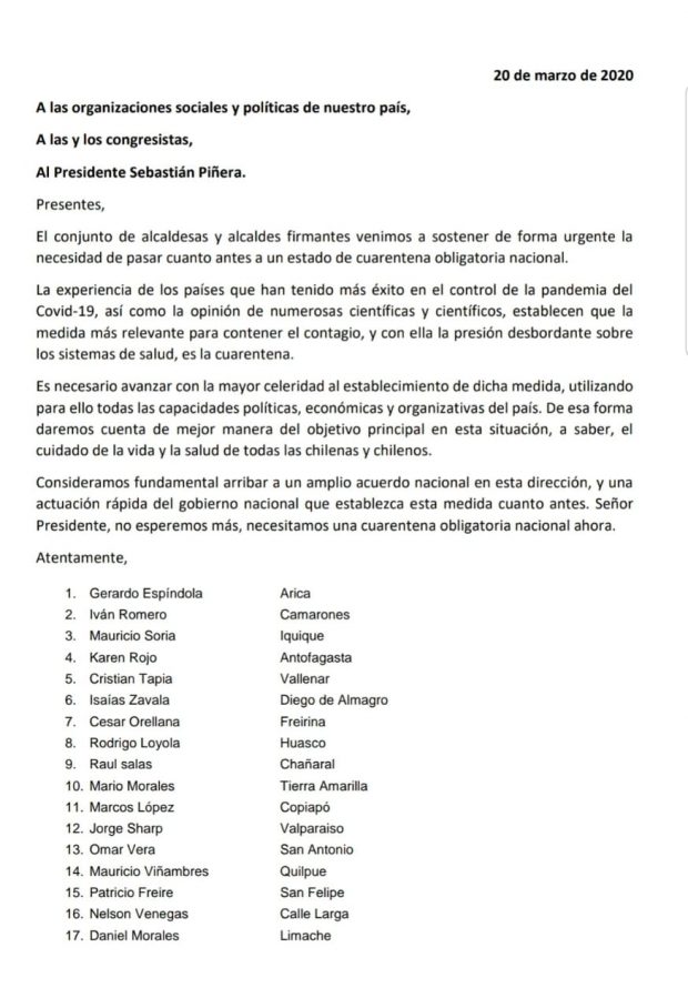Una vez más los alcaldes de Chile, en total 56 incluido el alcalde de Iquique Mauricio Soria, solicitan al Presidente de la República, que se decrete cuarentena para todo el país, como una medida que permita evitar o al menos disminuir la celeridad de transmisión del brote de coronavirus.