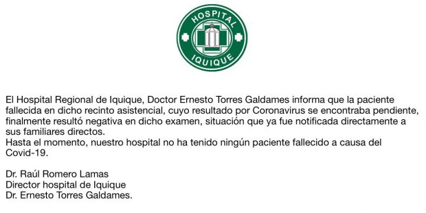 Mediante su cuenta de Twitter, el Hospital Regional de Iquique informó acerca del caso de la muerte de una mujer de tercera edad, ocurrida en ese recinto hospitalario, este viernes, descartando que se trate de corona virus.  El test que se le había aplicado, tras ser hospitalizada el miércoles 25, estaba pendiente de informe hasta esta noche de domingo.