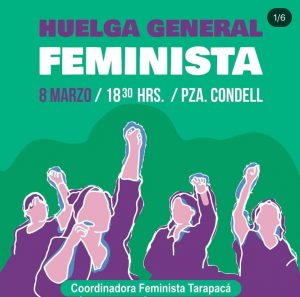 Una masiva marcha se realizará esta jornada de domingo 8, Día Internacional de la Mujer, para conmemorar esta fecha y reafirmar la lucha contra la violencia histórica contra la mujer, convocada por la Coordinadora Feminista de Tarapacá.