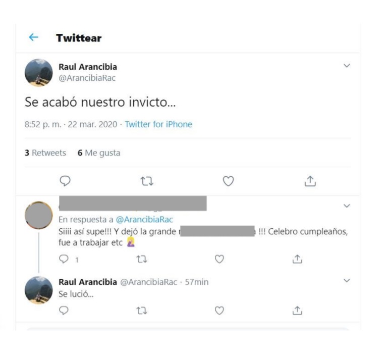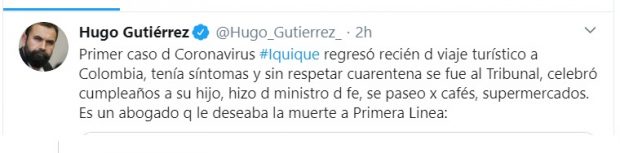 Seguramente nunca pensó el primer caso positivo de contagio con coronavirus en Iquique, que sus malos deseos se le devolverían tan pronto. En su cuenta de twitter publicó hace menos de una semana, en referencia al estallido social y los primera línea: “Esperando que se contagien entre ellos. Sería algo como justicia divina, se les devolvería todo el mal que han causado”. No pensó que él mismo, viniendo desde el extranjero y presentando síntomas, podría estar enfermo y eventualmente provocar contagio a sus más cercanos, incluyendo a su propia familia.