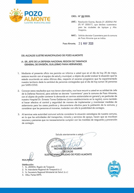Ante el sorpresivo aumento de casos covid-19 , con nuevos 7 contagios, sumando 30 en total, llevó al alcalde de Pozo Almonte, Richard Godoy, solicitar mediante que se declare cuarentena total en esa comuna. Lo hizo mediante un oficio en viado al Jefe de la Defensa Nacional (Jedena), general Guillermo Paiva,  que dicte cuarentena total para esa comuna.