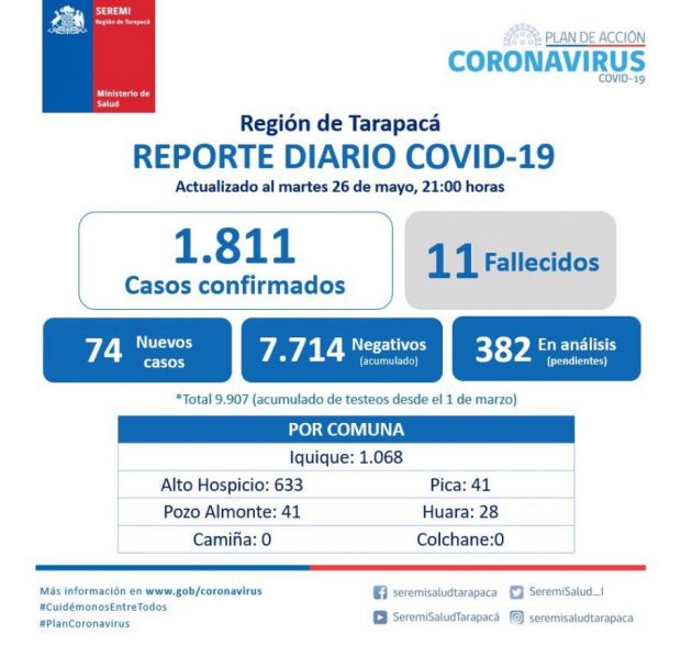 A once aumentó el número de fallecimientos a causa del coronavirus en Tarapacá, luego que se registraran otros tres casos en la jornada anterior, con cierre a las 21.00 hrs.  En tanto los nuevos contagios  son 74, aumentando a 1.811 el número total de personas infectadas en Tarapacá. Ante estas cifras y la evolución de la pandemia, la autoridad nacional decidió prolongar la cuarentena por una semana más.