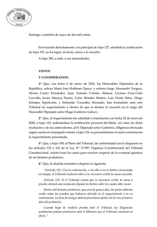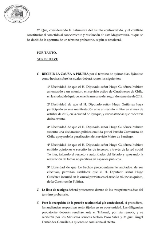 El Tribunal consttucional, que acordó recibir pruebas de las acusaciones contra Gutiérrez, en un plazo de 15 días, emitió una resolución, donde se moligera esta etapa de recolección de pruebas, especialmente en ,o referido a la acusación de intentar quemar un cuartel militar. Esto hace alusión a los hechos ocurridos el 19 de octubre, cuando parten las manifestaciones del estallido social en Iquique, lo que se traduce en una gran marcha.