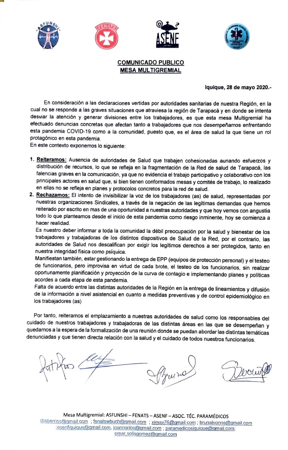 La declaración firmada por cinco gremios señalan que es su deber como multigremial, «informar a toda la comunidad la débil preocupación por la salud y bienestar de los trabajadores y trabajadoras de los distintos dispositivos de Salud de la Red, por el contrario, las autoridades de Salud nos descalifican por exigir los legítimos derechos a ser protegidos, tanto en nuestra integridad física como psíquica».