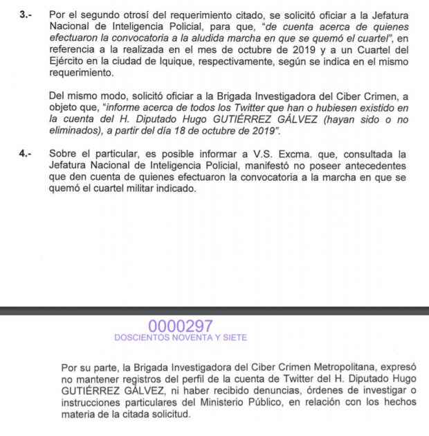 Mientras, a través del informe de la Brigada del Ciber crimen de la PDI, responde al TC: “No mantener registros del perfil de la cuenta del H. Diputado Hugo Gutiérrez Gálvez, ni haber recibido denuncia, ni órdenes de investigar o instrucciones particulares del Ministerio Público…”