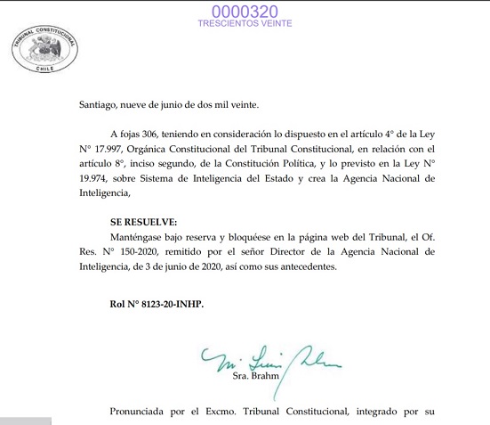 SE RESUELVE: Manténgase bajo reserva y bloquéese en la página web del Tribunal, el Of. Res. N° 150-2020, remitido por el señor Director de la Agencia Nacional de Inteligencia, de 3 de junio de 2020, así como sus antecedentes.