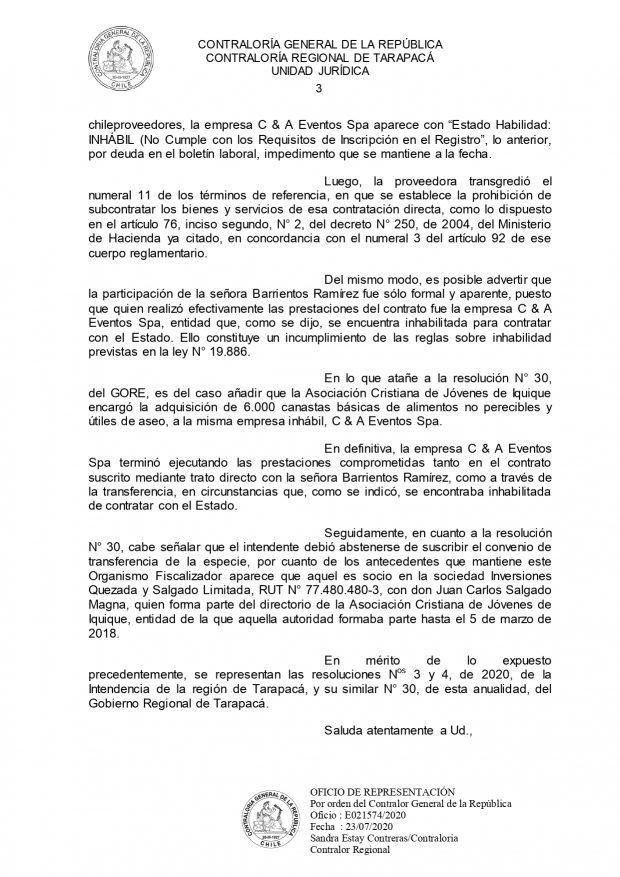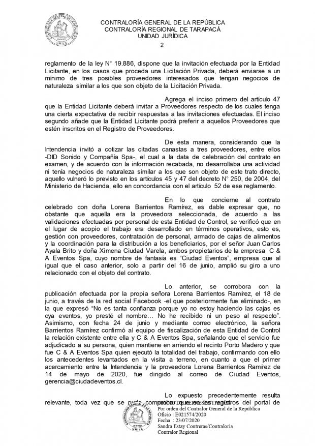 Otra de las irregularidades que detectó la Contraloría se refiere al contrato celebrado con Lorena Barrientos Ramírez, que, recordemos, fue quien declaró en redes sociales que «yo  presté el nombre». Y si bien, fue la proveedora seleccionada por la Intendencia ,  se verificó que en el lugar de acopio, el trabajo era desarrollado en términos operativos, la labor era desarrollada por Juan Carlos Ayala Brito y  Ximena Ciudad Varela, ambos propietarios de la empresa “Ciudad Eventos”.