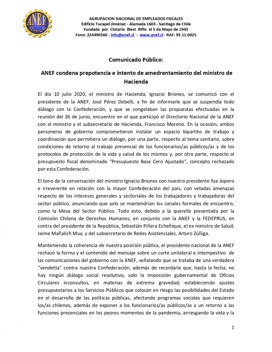 De acuerdo a lo informado por el Presidente de la ANEF mediante video conferencia, la llamada del Ministro Briones la recibió el viernes, directo a su celular, indicándole que la acción judicial que suscribió la ANEF, coartaba la posibilidad de mantener el diálogo entre ese organismo sindical y el gobierno.