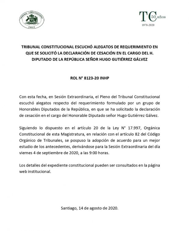 «…Se pospuso la adopción de acuerdo para un mejor estudio de los antecedentes, derivándose para la Sesión Extraordinaria del día viernes 4 de septiembre de 2020, a las 9:00 horas», indica el Tribunal Constitucional.