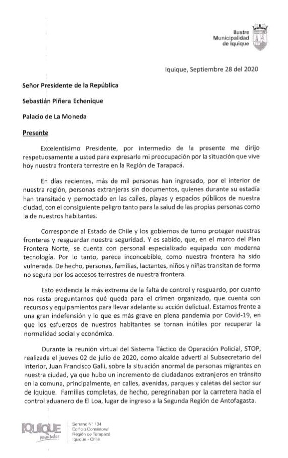 Durante la mañana de este lunes 28, el alcalde de Iquique Mauricio Soria Macchiavello, envió una carta al Presidente Piñera, para expresar su gran preocupación por la situación que se vive en la frontera terrestre de la Región de Tarapacá. El edil señaló que esta situación debe ser abordada a nivel nacional y que lo que ocurre con los grandes flujos migratorios que han visto los iquiqueños, se da en un contexto global en la macrozona, involucrando a varios países.