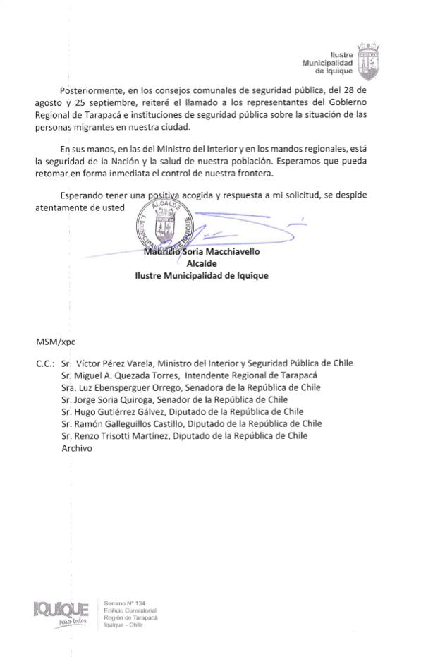 - Misiva señala que han ingresado por pasos no autorizados gran cantidad de migrantes sin documentos, quienes exponen su salud y la de los habitantes de Iquique