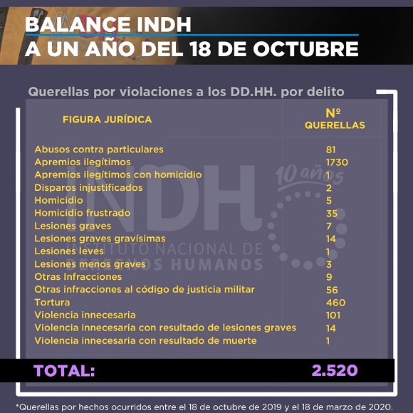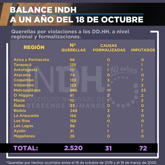 En la página del INDH se indica que se procesó el contenido de 2.349 querellas presentadas por el INDH ante los tribunales de justicia hasta el 31 de Julio de 2020, Se identifican 2.825 víctimas. Se mapean 4.075 hechos ocurridos en todo Chile que constituyen violaciones a los derechos humanos.