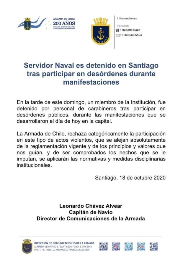 Respecto de la participación de los hechos en torno al ataque incendiario a la Iglesia de Carabineros, la Armada emitió una declaración para referirse a la participación y posterior detención de un «servidor naval. Así se pronunció sobre el caso: