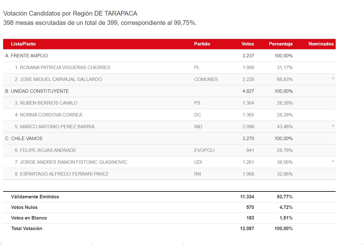 Las cifras consideraron informa oficial del Servel, con el 99.75 de las mesas escrutadas para gonbernadore; y 99.63 par alcaldes.