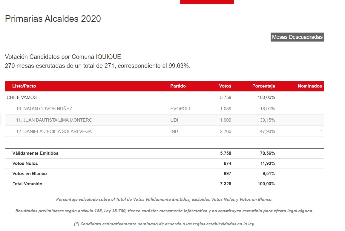 Mientras, la derecha en el Pacto Chile Vamos, integrado por Renovación Nacional, la UDI y Evópolis, logró 3.270 sufragios, lo que equivale al 28.85 de los votos válidamente emitidos.