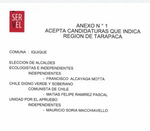 Se adjunta la publicación que publica los nombres de todos los candidatos a alcalde y concejales por las comunas de Tarapacá:
