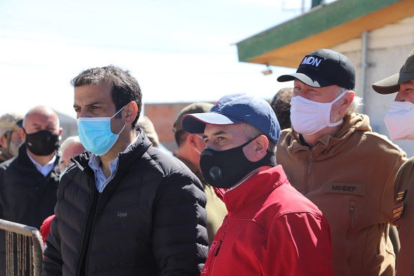 De chaqueta roja el Gobernador del tamarugal, Natan Olivos, acompañando a los ministros en su reciente visita a la zona.