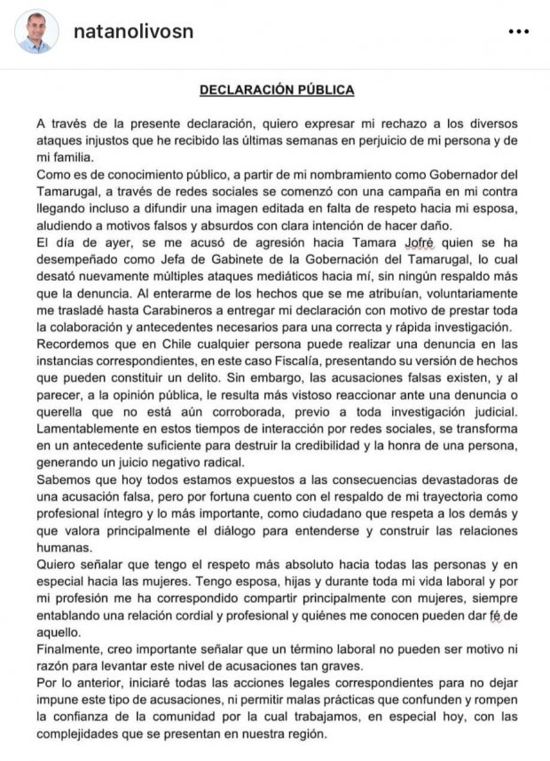 Por su parte, el hasta ahora gobernador Natan Olivos, emitió una declaración pública para dar a conocer su postura, afirmando que se trata de declaraciones falsas por parte de Tamara Jofré.  Más aún, dice que la campaña mediática en su contra, comenzó antes de asumir el cargo.