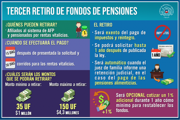 Tras la aprobación de los diputados, la reforma viene a agregar un nuevo artículo transitorio a la Constitución que especifica que, para mitigar los efectos sociales derivados del estado de excepción constitucional de catástrofe por calamidad pública, decretado a causa del Covid-19, se autoriza a los afiliados del sistema privado de pensiones, de forma voluntaria y excepcional, a realizar un nuevo retiro de hasta el 10% de los fondos acumulados en su cuenta de capitalización individual de cotizaciones obligatorias. El monto máximo de retiro será el equivalente a 150UF y el mínimo de 35UF.