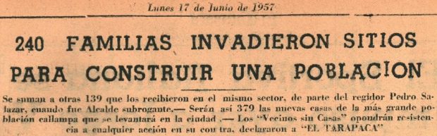 El 14 de junio de ese mismo año, aprovechando la ausencia del alcalde titular y la renuncia del director del Departamento de Obras Municipales, el regidor Pedro Salazar Ansaldo, alcalde subrogante, Dagoberto Valencia y el presidente de la CUT, Arturo Carvajal, procedieron a entregar terrenos a 139 familias deslindando los sitios con empleados municipales. Los sitios tenían la extensión de 5 metros de frontis por 20 metros de fondo.