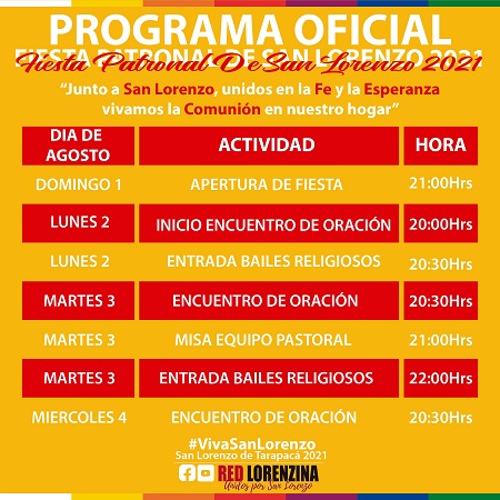 Al igual como ocurrió con la fiesta de La Tirana, este año, por segunda vez, la festividad de San Lorenzo de Tarapacá, patrono de los mineros, los transportistas, los diáconos y otras invocaciones, se realizará de manera virtual teniendo como orientación el siguiente slogan: “Junto a San Lorenzo, unidos por la fe y la esperanza vivamos la comunión en nuestro hogar”,