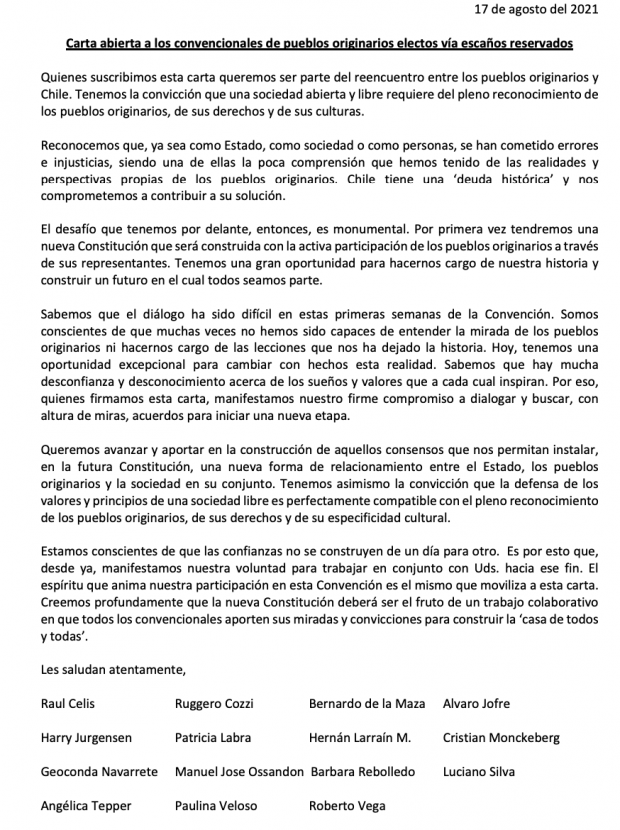 «Quienes suscribimos esta carta queremos ser parte del reencuentro entre los pueblos originarios y Chile.» «Chile tiene una ‘deuda histórica’ y nos comprometemos a contribuir a su solución.» Comparto «Carta abierta a los Convencionales de PPOO» suscrita por 15 pares de la CC.