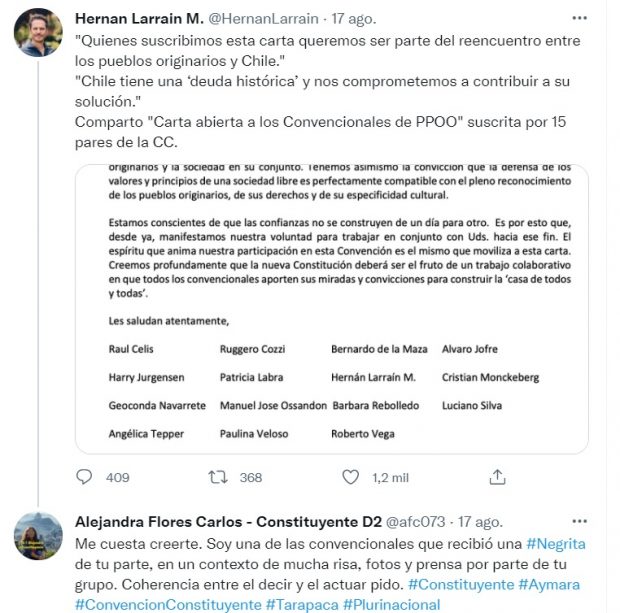 “Me cuesta creerte”, respondió la convencional independiente por el Distrito 2 de Tarapacá, Alejandra Flores, al constituyente Hernán Larraín, que en twitter hizo pública su adhesión a una carta que suscribiera junto a 15 de sus colegas, señalando que quieren ser parte del reencuentro con los pueblos originarios. El tema también lo abordó durante una entrevista que le realizaron en Emol TV, donde valoró la carta suscrita por 15 convencionales de RN y Evópoli (no suscribió la UDI), y su disposición a trabajar con los pueblos originarios para saldar deudas históricas.