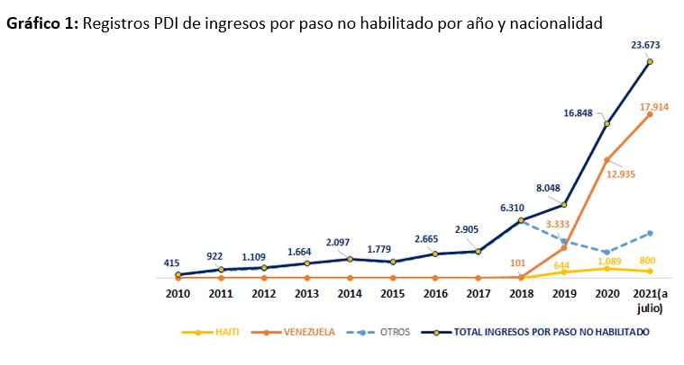 La migración es un fenómeno creciente en Chile, en la región y en el mundo. Las cifras oficiales de migración regular no dan cuenta de la realidad en Chile, pues esconden el sustantivo aumento del ingreso de personas por paso no habilitado (IPNH), constante desde el 2010. En dicho año ingresaron 415 personas, luego el 2015 lo hicieron 1.779, en el 2019 lo hicieron 8.048, el 2020 ingresaron 16.848, para llegar con la cifra récord de 23.673 sólo entre enero y julio de 2021 y que podemos proyectar hasta fin de año con un número histórico, sin precedentes y preocupante (Ver Gráfico 1).